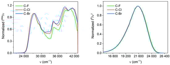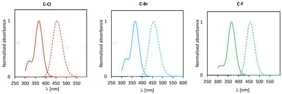 Figure 6 presents the theoretical absorption and fluorescence bands of the studied molecules in chloroform in graphical form. Both the theoretical and experimental absorption (Figure 1) spectra indicate the presence of additional low-intensity peaks within the same range. These peaks result from electronic transitions to higher excited states, which have a lower probability of occurrence (hence their lower intensity). These are so-called spin-forbidden transitions or transitions between less favorable energy states, as confirmed by the agreement between theory and experiment. In the case of the C-Br spectrum, due to the presence of bromine (heavier than chlorine), these peaks are shifted more significantly toward the red (C-Br: 326.16 nm, 317.41 nm, and 313.87 nm; C-Cl: 325.73 nm, 314.99 nm, and 313.43 nm) and show greater differences in intensities. Similarly, as with C-Cl and C-Br, the less intense peaks in the theoretical spectrum of C-F (326.27 nm, 313.61 nm, and 303.58 nm) correspond to real transitions between higher excited states. Fluorine-containing compounds as substituents may exhibit better theoretical–experimental agreement at lower energies due to smaller spin–orbit coupling differences compared to bromine or chlorine. Differences in the intensities of the additional peaks, hypsochromically shifted relative to the main band (π-π* transition), between experiment and theory arise because theoretical calculations often assume ideal conditions and omit certain experimental factors, such as interactions of the molecules with the solvent or other molecules in the sample. Furthermore, both the theoretical and experimental spectra support the earlier hypothesis regarding the influence of other orbitals on the absorption bands of the molecules under study. The theoretical (Figure 6) and experimental (Figure 1) fluorescence spectra are in very good agreement, with no additional low-intensity peaks, suggesting that fluorescence occurs from a single dominant excited state to the ground state. For C-Br, the red shift in fluorescence is due to the greater energy difference between the excited state and the ground state for the bromine-containing compound. Excellent agreement between experiment and theory is also observed for C-F, where fluorescence is clearly associated with a single excited state, with no additional fluorescence transitions. The analysis of the spectrum in chloroform yields analogous conclusions when other solvents are used.