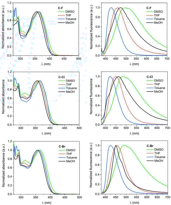 Figure 3 and Figures S2 and S3 present the electronic absorption and fluorescence spectra of the tested compounds in different solvents. The influence of solvent polarity on the absorption is ambiguous, e.g., the wavelength of the long-wave band in THF is 360 nm and in DMSO it is 364 nm, i.e., the bathochromic effect occurs; but comparing its position in toluene and DMSO (365 nm and 364 nm), the opposite effect occurs for C-F (Table 1). In terms of fluorescence, a regular bathochromic shift of the band maximum is observed with increasing solvent polarity. This spectral effect is more pronounced, and, for example, changing the solvent from toluene to DMSO shifts the C-F fluorescence maximum from 428 nm to 489 nm, which indicates a greater stabilization of the excited singlet state in polar solvents. This phenomenon is characteristic of derivatives with increased dipole moments and charge-transfer (CT) character in the excited state [59,61].