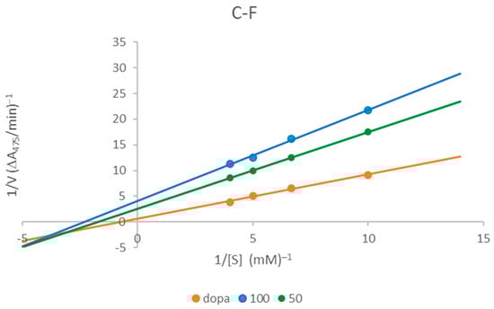 The Lineweaver-Burk plots for inhibition of tyrosinase for C-F. The plot is expressed as 1/velocity [ΔA475/min−1] vs. 1/substrate concentration [mM−1]. dopa refers to an L-DOPA solution without an inhibitor, the value 100 refers to an L-DOPA solution with an inhibitor at a concentration of 100 µM, and the value 50 refers to an L-DOPA solution with an inhibitor at a concentration of 50 µM.