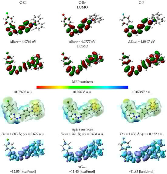 The spectral properties discussed below include one strong absorption and emission band, corresponding to the π-π* transitions (HOMO → LUMO photoexcitation). However, non-negligible contributions from other orbitals may also occur. To elucidate the nature of these electronic states, the density variation upon photoexcitation (Δρ (r)) computed for the first electronic transitions is graphically depicted in Figure 5. The Δρ (r) plots reveal that the density depletion zones (blue) are primarily delocalized on the thiazole ring, the π-electron linker, and the carbazole moiety. Conversely, the sites of density increment (purple) are scarcely visible on the carbazole part and the outer benzene ring for all molecules. Furthermore, the solvent polarity markedly impacts the parameters characterizing Δρ (r) (Table S2). For each derivative, DCT is reduced with increasing solvent polarity and the difference is 1.825 Å, 1.793 Å, and 1.1985 Å for C-Cl, C-Br, and C-F, respectively. For all derivatives, the DCT indicates the CT character and confirms the contributions from the HOMO → LUMO transition; although, minor contributions from other orbitals should be expected. In particular, they can come from the transitions HOMO: HOMO → LUMO+1 with a participation of 3% for C-Cl and C-Br and 2% for C-F. The quantity of transferred charge diminishes monotonically as a function of solvent polarity. The greatest difference, ΔqCT, between the extreme environments (vacuum and aqueous phase) is observed for C-Br, amounting to 0.194 e, while the smallest is for C-F (0.181 e). Furthermore, the C-Br molecule exhibits the highest value of qCT. Similar to the transferred charge amount, the C-Br molecule also shows the highest charge-transfer distance, whereas C-F has the lowest. For each derivative, DCT decreases with increasing solvent polarity, with the difference being 1.825 Å for C-Cl, 1.793 Å for C-Br, and 1.1985 Å for C-F.