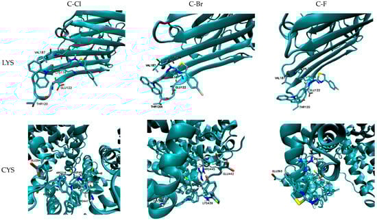 Nowadays, the search for more and more efficient fluorescent markers, used in various fields of science, especially in medical imaging, is underway. Such markers, in order to be used in bioimaging, must have a characteristic functional group that allows an easy and quick conjugation with the protein [61]. As shown earlier, the tested compounds are not suitable for TPA imaging; however, introducing into their skeleton a suitable functional group, such as -CHO, -COOH (conjugation with the -NH2 groups of the protein, ConA in our study), maleimide, or pyridyl disulfides (conjugation with the protein through the -SH groups, HSA) can be a great tool in single-photon imaging. The performed AutoDock simulations showed that all derivatives have the highest affinity for LYS116 (Figure 7) during conjugation with ConA. It is, therefore, the site of the greatest probability of conjugation through the amino group of the macromolecule. In all instances, the binding energy (ΔGb) is −5.5 kcal/mol (Table S9), and the active binding site exhibits inhibition constants (Ki) of 0.78 μM for C-Cl, 0.89 μM for C-Br, and 0.82 μM for C-F. The carbazole molecules are positioned within an aromatic cage formed by VAL187, LYS116, VAL188, THR120, GLU122, and where no π-π* interactions occur, and the system lacks stabilization by hydrogen bonding. During the interaction with HSA, the binding center for C-Cl is CYS448, while for C-Br and C-F, it is CYS438. As the dyes adjust spatially, they become surrounded by additional amino acids, with C-F demonstrating the highest affinity (Table S10), evidenced by a ΔGb of −9.8 kcal/mol and a Ki of 0.85 μM. For C-Cl, ΔGb is −9.4 kcal/mol and Ki = 0.75 μM, and for C-Br, ΔGb is −9.5 kcal/mol and Ki = 0.93 μM. The biocomplexes formed at this active site are not stabilized by additional interactions in the dye–amino acid system. It is worth mentioning that in this case, both CYS438 and CYS448 are active binding centers with the highest probability of interaction in the protein–marker system. For C-Cl and C-Br, is only 0.8 kcal/mol, while for C-F it is 1.0 kcal/mol. In the process of adjusting to the aromatic cavity, in each case, all rotations occur on the bonds of the π-electron bridge, by changing the angles C=N-N and N-N-C. The largest geometric changes during the fitting were observed for the C-F-LYS derivative, where the change in the dihedral angle of C=N-N was 0.04851° and −0.04438° for N-N-C. In turn, for the C-F-CYS system, the changes in the values of these angles amount to 0.03053° and −0.01308°, respectively. For each investigated derivative, significantly greater changes in the dihedral angles of the π-electron bridge occur during the adjustment to the ConA active center, and the mean differences are 0.02198° for C=N-N and 0.01494° for N-N-C. Changes in the described angles indicate slight structural changes in the presented molecules during the formation of an active biocomplex with the protein.