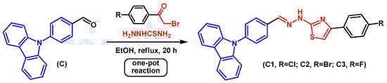 The titled carbazole-based thiazoles (C-Cl, C-Br, and C-F) were prepared in a simple and facile one-pot three-component reaction of appropriate benzaldehyde (C), thiosemicarbazide, and the corresponding 4-substituted 2-bromoacetophenones in anhydrous ethanol solution under reflux for 20 h. This simple reaction proceeds with greater than 99% yield without the use of an acid catalyst [61]. The synthesis of target compounds C-Cl, C-Br, and C-F is outlined in Scheme 1. All obtained products were purified on silica gel column chromatography and fully characterized employing spectroscopic methods, 1H, 13C NMR, and ESI-HRMS analysis (see Supplementary Information). Characteristic signals from the thiazole ring-5H protons (at about 8.18 ppm), hydrazine NH groups (at about 12.32 ppm), the C-NH group (at about 170 ppm), and peaks corresponding to their molecular [M+H]+ ions indicating the formation of desired products were observed in the NMR and ESI-HRMS spectra.