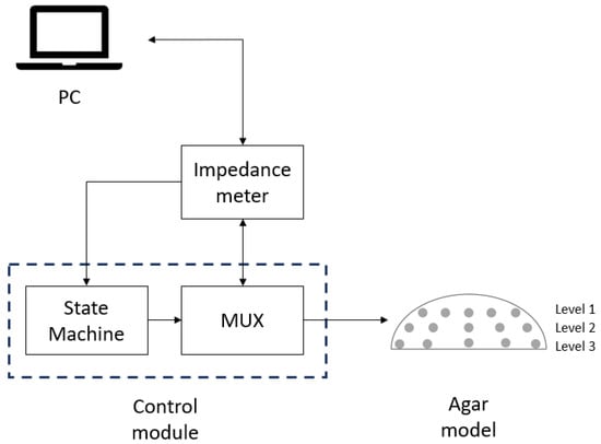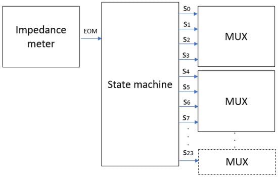 A state machine is used to control the data acquisition process and the switching between different electrodes during scanning, optimizing data transfer and reducing the complexity of data acquisition [29]. The state machine manages the order in which the electrodes are activated during measurement acquisition. It instructs the MUX to sequentially select each pair of electrodes to send the electric current and measure the resulting voltage. The diagram in Figure 4 shows the connection between the state machine, the MUX, and the impedance meter.