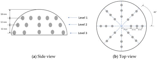 For current injection into the agar models and impedance measurement, AgCl electrodes with a diameter of 10 mm were used. The electrodes are distributed in a latex insulating cup with dimensions similar to the standard B-cup, as shown in Figure 2. A side view of the latex cup Figure 2a is presented; the electrodes were distributed in three levels of 8 electrodes at each level. A total of 24 electrodes were used; they were distributed in 3 rings of 8 electrodes each; in each ring, each electrode was separated 45° from the adjoining electrodes Figure 2b.