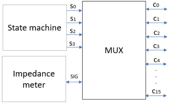 A multiplexer was used to distribute the injection current between the electrodes. The multiplexer (MUX) is an electronic device used to combine multiple signals on a single line or to select one of several signals and transmit it on a single output line [27]. Basically, it acts as a “selector” to direct a specific signal from among several to a desired location. The MUX allows the injection current to be distributed to all the electrodes until the sweep of the electrode pairs is complete [28]; the impedance meter sends the injection current and performs the measurement of the impedance values. Figure 3 shows the diagram explaining the relationship of the MUX to the other components of the system. Each multiplexer has 16 output channels (C) and requires 4-bit logic combinations (S) to select the output channel of the impedance meter signal (SIG). The MUX outputs are connected to the ring electrode array of the latex cup.