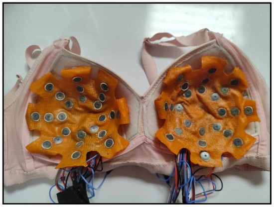 A modified brassiere cup device that could be worn by the patient was proposed to increase the portability of the system. A standard B-cup brassiere was designed with a Velcro liner that serves to attach the latex cup to the electrodes, following the distribution of electrodes described in Figure 2. Figure 6 shows the brassiere cup with the 48 electrodes attached to the latex cups.