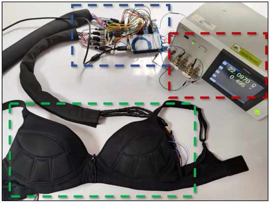 Figure 7 shows the complete physical prototype, with all modules interconnected for impedance measurement. The impedance meter is delimited with red dotted frame, the control module has blue dotted frame, and the brassiere cup has green dotted frame.