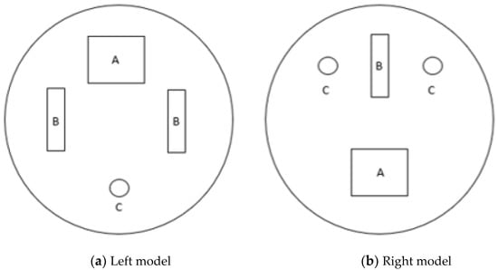 Agar models with similar conductivity to real tissue were used, with the electrical conductivity set to the following parameters (σ—Siemens/meter): breast tissue σ = 0.052 and e-tumor tissue σ = 1.125 [33]. Agar models are shaped and sized to fit the standard B-cup electrode brassiere cup (A semi-sphere with measurements 45 mm × 60 mm). Figure 8 illustrates the position and shape of the tumors in the agar models (left model and right model).