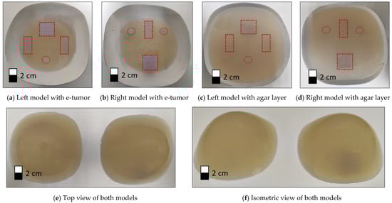 A mold was used to make the agar models, which were built up in steps, first the breast tissue and then the tumor inserts, finishing with a new layer of breast tissue to give the model more stability. Figure 9a,b shows the model after introducing the e-tumors with modified electrical properties. To improve the stability of the model, an additional layer of agar with breast tissue properties is added, as shown in Figure 9c,d of the left and right models, respectively. The final models used to perform the impedance measurements and 3D reconstructions are shown in Figure 9e,f. Red dotted lines were used to highlight the position of the e-tumors within the agar model.