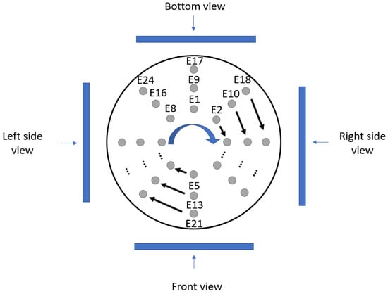 Figure 11 describes the different perspectives used to present the image reconstruction results in this paper. The electrodes in each cup have been numbered (from E1 to E24). The electrode numbering starts from the inner ring array at the top electrode (E1), continues clockwise until all electrodes in the ring array are completed, and continues in the same numbering order until all 24 electrodes are completed (E24).