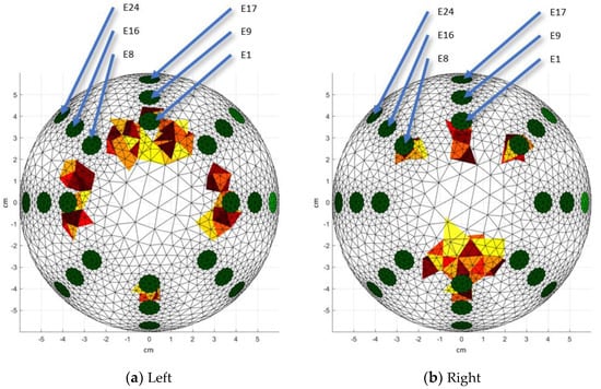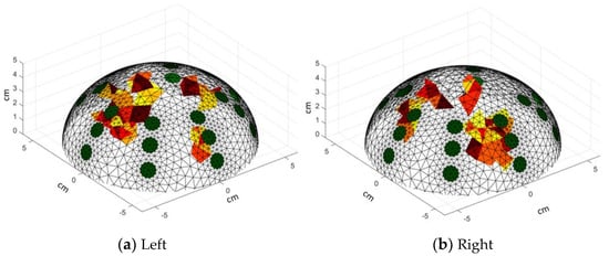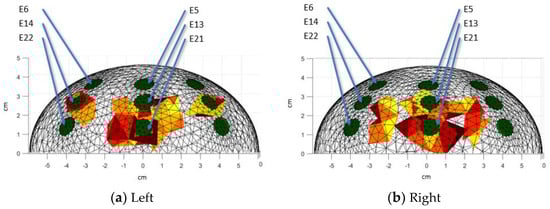 Figure 12 shows the top view of the 3D reconstruction of the agar molds (left model and right model). The green circles represent the position of the electrodes on the latex cup. A cm reference system was used to facilitate the location of the localized e-tumors. Figure 10a shows e-tumor A in the upper part (between E8 and E1), which stands out from the others because of its larger size. On the left (in front of E7) and right (in front of E3) sides of the reconstruction, e-tumor B is shown, and in the lower part, e-tumor C (in front of E5) is shown.