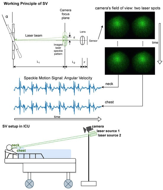 A typical SV setup consists of one laser source and a camera that is defocused at the laser-illuminated spot. In the camera’s defocused field of view, a random intensity pattern of bright and dark spots can be observed. When the illuminated surface is optically rough on the scale of the laser wavelength, the reflected laser light waves differ in the path lengths. And that leads to constructive and destructive interference. This is due to the monochromatic and phase-coherent nature of the laser light. The SV setup, as used inside the ICU, is shown in Figure 1. It comprises a near-focused camera (i.e., the focal plane is between the detected surface and the camera lens) and two laser sources. The relative positioning of the camera and laser sources is fixed during recording, rendering the location of the two laser spots inside the camera’s field of view also fixed. Two regions of interest containing the two laser spots are manually selected. The two laser sources are placed next to each other and parallel to the camera. One laser source is aimed at the neck of the patient and the other is aimed at the thoracic area (i.e., on blankets). The thoracic area was the main focus of our investigation on instantaneous heart rate and respiration rate monitoring in an ICU setting. However, we also included the neck because it is relatively distant from the heart and has weaker cardiac motions. Thus it was considered to be a challenging spot and served as SV’s technical validation. Under the given imaging condition, angular changes of the detected surface are magnified significantly whereas transversal or axial movement barely has an impact []. The equation that maps the displacement between consecutive laser speckle patterns to the angular change of the detected surface is detailed in our previous work [].