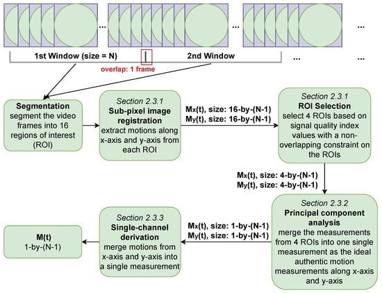 Summarized workflow of our novel motion (i.e., displacements between consecutive video frames) extraction algorithm (MRPD). The sliding window size is 10 s with an overlap of one video frame. The first window has a length N equal to 3000 video frames (i.e., 300 fps) while the following ones have a length N equal to 3001 video frames, with each window starting from its previous window’s last video frame.