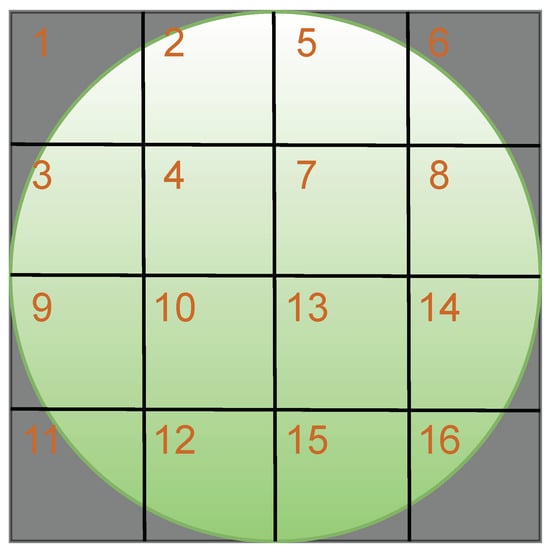 Instead of extracting angular velocity from the whole video frame of the laser speckle pattern, each video frame was segmented into 16 ROIs equal in size as shown in Figure 3. The size of each ROI is 125-by-125 pixels. This ROI size was chosen based on the following reasons. First, it covered a sufficient area to avoid the de-correlation between consecutive video frames and thereby guaranteed the ability to extract movements of large magnitude. Second, if the ROI size was bigger (e.g., 250-by-250 pixels), the noise component could not be canceled sufficiently due to the limited number of ROIs available (i.e., 4 in this case). If the ROI size was smaller, the signals extracted from each ROI could be noisy, and more computational power would be needed. Last, it was square instead of rectangular or circular because it was not known beforehand in which direction the laser speckles moved between frames. To extract angular velocity signals from each ROI, i.e., displacements between consecutive video frames, we utilized the sub-pixel image registration algorithm proposed by Guizar-Sicairos et al. [] with a sub-pixel accuracy of 0.01 pixels. Per the 10-s window, for each ROI(i) with i indicating the index number of the ROI, the angular velocity signals along the x-direction and y-direction were estimated as and , respectively.