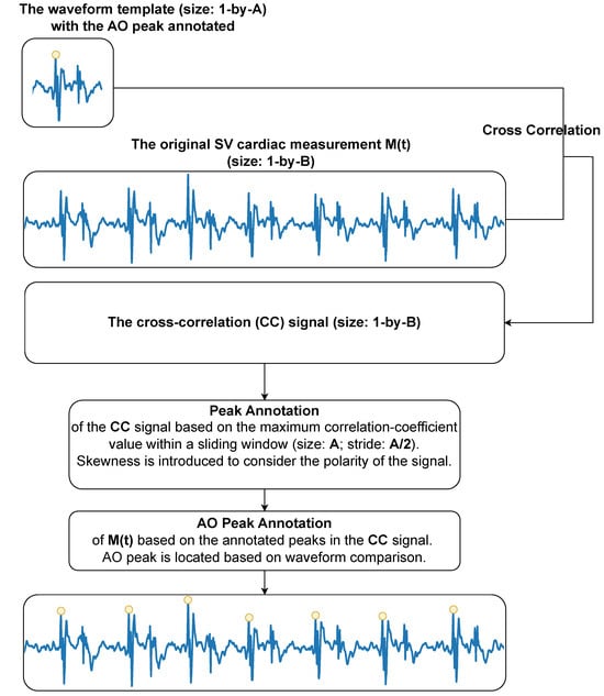 Similar to Gyrocardiography [] which detects angular velocities on the chest introduced by the contractions of the heart, there is inter- and intra-subject variability observed in the SV waveform []. Different measurement spots (i.e., the neck and the chest) might yield different cardiac waveforms within the same subject. It was further observed that due to the intra-subject variability of the SV waveform over time, the peak of the highest amplitude within one cardiac cycle does not always correspond to the AO peak (i.e., the characteristic cardiac peak that corresponds to the aortic valve opening []). Sometimes the polarity of the SV waveform is flipped during recording (i.e., the amplitude of the AO peak switches from positive to negative values), which can be attributed to the respiration-induced displacement of the laser spot on the detected surface (i.e., a blanket). To reduce the influence of inter- and intra-subject variability of the morphology of the SV signal, a new semi-automated waveform-based cardiac peak detection algorithm was developed. This method starts with manually selecting one complete cardiac cycle with the AO peak annotated as the waveform template for each unique 20-min measurement, which is followed by an automated process. The automated process consists of two major steps: (1) locating the peaks of the cross-correlation signal between the waveform template and the whole SV cardiac measurement; (2) mapping these peaks to their corresponding AO peak locations based on waveform comparison. A workflow diagram is displayed in Figure 4. The details are presented in Algorithm A1 in the Appendix A.