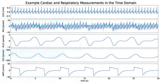 Figure 5 shows a segment of the measurements in the time domain from one patient, including ECG, , , and , and AWF. denotes the SV cardiac motion (angular velocity). It is observed that by extracting the baseline wander of a signal that has a respiratory periodicity can be obtained, denoted as . However, the pixel range of only covers up to about four pixels, which is lower than the cardiac movements on the measured surface (about 20 pixels). This is because only consists of respiration-induced low-frequency variations but not the respiratory motions themselves. In contrast, represents the cumulative pixel displacements (about 600 pixels and 1000 pixels, respectively), taking into account the co-effect of both cardiac and respiratory movements on the measured surface. also exhibits clear periodicity and can be used to extract instantaneous respiration rates. Of course, the pixel ranges here do not carry any absolute meaning. What differentiates from is its waveform, which is a more authentic representation of the respiratory movement. Therefore, carries more information than , which entails not only the instantaneous respiration rate but also the respiratory motion. It is worth noting that the waveform of the AWF signal here indicates the airway flow, i.e., the volume of air passing through a point in the airway per minute. Therefore, although all three measurements exhibit respiratory periodicity, they are from different origins.
