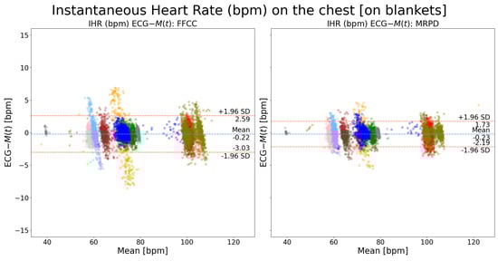 Bland–Altman plots of instantaneous heart rate on the chest (ECG-): a comparison between FFCC and MRPD motion extraction methods. Each color indicates recordings from one patient. The waveform-based cardiac peak detection algorithm was used. The FFCC method refers to the full-frame motion extraction algorithm while the MRPD method refers to our new algorithm: the multi-ROI-based motion extraction algorithm.