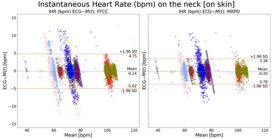 Bland–Altman plots of instantaneous heart rate on the neck (ECG-): a comparison between FFCC and MRPD motion extraction methods. Each color indicates recordings from one patient. The waveform-based cardiac peak detection algorithm was used. The FFCC method refers to the full-frame motion extraction algorithm while the MRPD method refers to our new algorithm: the multi-ROI-based motion extraction algorithm.
