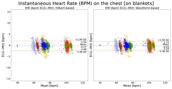 Bland–Altman plots of instantaneous heart rate on the chest (): a comparison between waveform-based and Hilbert transform-based peak detection methods. Each color indicates recordings from one patient. The MRPD motion extraction method was used.