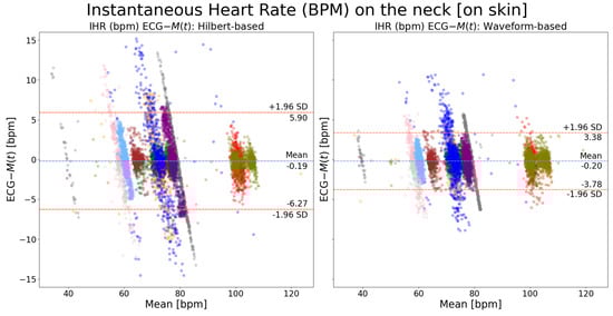 Bland–Altman plots of instantaneous heart rate on the neck (): a comparison between waveform-based and Hilbert transform-based peak detection methods. Each color indicates recordings from one patient. The MRPD motion extraction method was used.