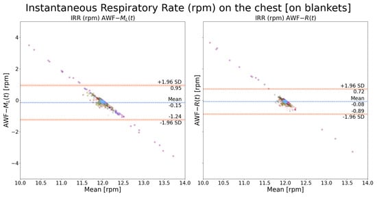 Instantaneous respiration rates were extracted, respectively, from and and the AWF signal was used as the reference. As shown in Figure 10, it can be observed that and yielded very similar results when the measuring spot was on the chest, with the bounds of LOA around 1 rpm. In comparison, as shown in Figure 11, yielded slightly better results than . The points form a straight-line distribution because there is no respiration rate variability due to the mechanical ventilator.
