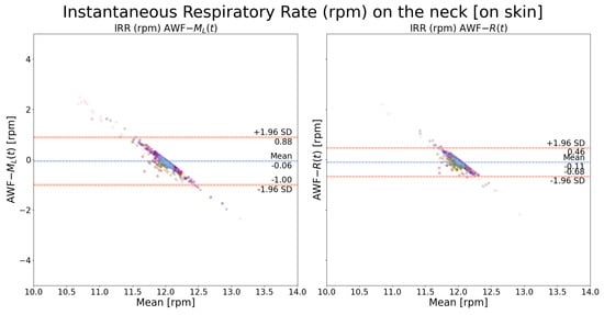 Bland–Altman plot of instantaneous respiration rate on the neck: a comparison between AWF- and AWF-. The is the mechanical ventilation signal with a stationary frequency equal to 12 rpm. Each color indicates recordings from one patient.