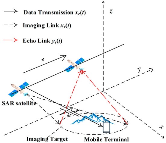 Spaceborne synthetic aperture radar (SAR) provides high-resolution Earth observation capabilities in all weather conditions and at all times. It has significant potential for applications such as battlefield surveillance, environmental protection, disaster monitoring, ocean observation, and geological mapping [1,2,3]. As communication networks evolve to space–air–ground integrated systems and deploy low Earth orbit satellite constellations, electromagnetic spectrum resources in space become scarce. SAR satellites have licensed spectrum resources from L-band to Ku-band. Utilizing these quality resources for radar-communication spectrum sharing is a key focus in satellite communication research [4]. Furthermore, satellite SAR remote sensing heavily depends on ground-based relay transmission facilities. In remote and offshore areas with limited infrastructure, mobile terminals are needed to receive real-time imagery data of surrounding regions. However, the lack of traditional large ground-based data transmission stations can cause communication congestion and delays in transmitting large numbers of imagery data. Additional communication links between ground data receiving stations and mobile users are essential for data distribution, but they can introduce delays in obtaining images of time-sensitive targets. As a result, reducing dependence on ground-based facilities has become a key focus of research [5].