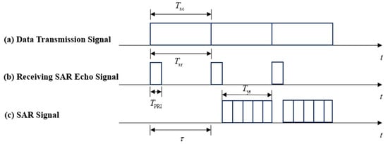 The concept of STAR (Simultaneous Transmission and Reception) is purposed to synchronously transmit and receive electromagnetic signals at the same space–time frequency; theoretically, it can improve the spectral efficiency and system capacity. STAR offers the possibility of simultaneous operation of SAR echo reception and data transmission systems; however, the transmitted signals may be leaked to the receiver through a low-noise amplifier, thus causing the problem of dramatic self-interference. The technologies to suppress self-interference can be divided into airspace self-interference suppression technologies, RF domain self-interference suppression technologies, and digital domain self-interference suppression technologies [27]. Jonathan et al. designed a digital phased array, in which the aperture is divided into a transmitter subarray and a receiver subarray; at the digital end, it can eliminate the interference of the received signals going into the low-noise power amplifier, thus achieving the isolation of the received and transmitted signals with a difference of 160 dB within a 100 MHz bandwidth [28]. In addition, Xu et al. [29] also eliminated interference from the transmitted signals by introducing filters in the low-noise power amplifier section. Figure 2 shows the integrated sequence of spaceborne SAR data transmission.