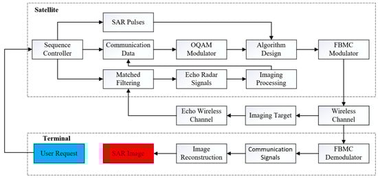In response to the conflicting demands between real-time satellite communication and high-resolution synthetic aperture radar (SAR) imaging, we propose a method that aligns the data transmission rate with the imaging data volume. This approach balances SAR performance with the requirements for real-time data transmission. To meet the need for mobile user terminals to access real-time SAR imagery data of their surroundings without depending on large traditional ground data transmission stations, we developed an application system based on filter bank multicarrier offset quadrature amplitude modulation (FBMC-OQAM). To address the interference problem with SAR signals’ transmission and reception, we developed a signal sequence based on spaceborne SAR echo and data transmission and reception. This system enables SAR and data transmission signals to share the same frequency band, radio frequency transmission system, and antenna, creating an integrated sensing and communication system. Simulation experiments showed that, compared to the equal power allocation scheme for subcarriers, the echo image signal-to-noise ratio (SNR) improved by 2.79 dB and the data transmission rate increased by 24.075 Mbps.