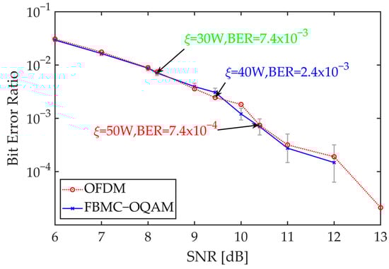 Figure 4 indicates that the BER of FBMC was slightly lower than that of OFDM at low SNR levels. When the power threshold was set to 30 W, 40 W, and 50 W, the BER excluding channel encoding and decoding were , , and , respectively. Efficient channel encoding and decoding techniques, such as low-density parity-check codes or turbo codes, can be employed to significantly reduce the BER, often achieving a BER of or lower. This ensures the reliability and integrity of data transmission, thereby meeting the BER requirements of satellite communication systems.