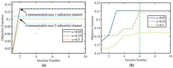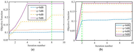 At , the convergency performance of the objective functions of Algorithms 1 and 2 under different is illustrated in Figure 6.