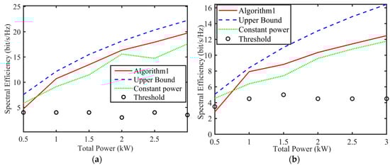 Spectral efficiency versus total power. (a) = 6 dB scheme. (b) = 3 dB scheme.