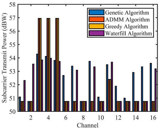 Based on Figure 8 and Figure 9 and Table 2, the genetic algorithm showed similar performance to the ADMM-based subcarrier allocation algorithm. The power allocation of the ADMM algorithm was the same as that of the greedy algorithm. The ADMM algorithm achieved the optimal SNR of echoes, while the genetic algorithm excelled in spectral efficiency but reduced the SNR of echoes. Although the ADMM algorithm did not greatly affect frequency efficiency, it improved the SNR of echoes. In general, the ADMM algorithm achieved the highest weighted score and displayed superior performance.