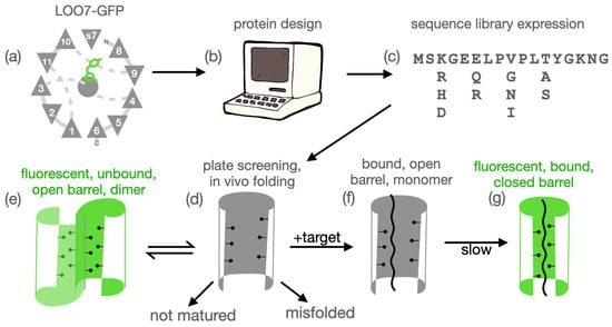 Overview. (a) TOPS [13] diagram of LOO7-GFP with bound target peptide s7 replacing beta strand 7. (b) Computational protein design of the surrounding residues using Rosetta or DEEdesign accommodates the target peptide. (c) Design followed by simulated melting generates a sequence expression of desired complexity. The physical library is synthesized by degenerate-oligonucleotide assembly PCR and transformed into bacteria. (d) Individual clones co-expressed with target may fold. Or, they may misfold and/or not mature. (e) Correctly folded, unbound LOO-GFP, an open barrel, may form a dimeric state which matures and fluoresces. (f) Binding of target peptide shifts equilibrium to the bound state. (g) Target-bound LOO-GFP may or may not undergo barrel closure, the kinetic slow step, leading to maturation/fluorescence.