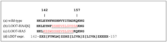Left-out strand and targets. (a) Wild-type sequence of strand 7 (residues 139–160) from sfGFP-OPT [8]. (b) LOO7-HA4 strand 7 sequence with target peptide HA4 (red) derived from residues 139–150 of Influenza A virus (A/Thailand/16/2004(H5N1)) hemagglutinin. (c) LOO7-HA5 strand 7 sequence with target peptide HA5 (red) derived from residues 135–148 of Influenza A virus. (d) PROSITE expression [28] used to screen for candidate LOO7 target sequences, where X={C},Z={CP}.