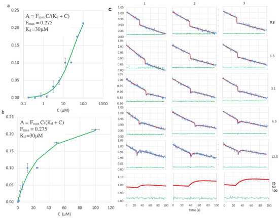 Peptide binding. (a) Log and (b) linear scale plots for peptide concentration, C, versus observed signal amplitude, showing fit (green) to the Langmuir equation to give KD = 30 μM (r = 0.99). (c) Fluorescence (blue, ex485/em508) versus time after opening the shutter for all peptide concentrations (right side, μM), in triplicate (top margin) except for 25–100 μM. The Y-axis for each in relative counts (blue lines, points) normalized to the starting value for each run. Concentrations 25–100 μM were run at a 2× higher dilution and smaller slit width. Red: least squares fit. Green: residual of the fit.