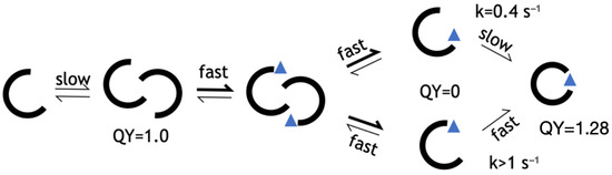 Kinetic model for HA5. From left to right: unbound monomer, fluorescent unbound multimer, peptide-bound multimer, peptide-bound monomer with open barrel, fluorescent peptide-bound monomer with closed barrel. Values for QY and rate determined in this work.