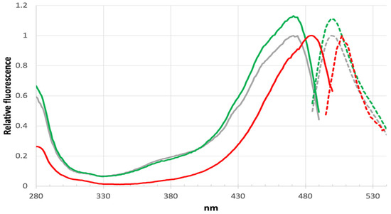 A significant blue shift in excitation and emission is found for LOO7-HA5:ES1•HA5 versus LOO7-HA4:DS2•HA4 or wild-type GFP, with peak excitation at 471 nm and peak emission at 499 nm, shifted by −13 and −9 nm, respectively (Figure 7). T65A removes a hydrogen bond donor from to the N2 imidazolidone ring nitrogen, destabilizing the anionic form of the PIA chromophore. By removing that stabilizing interaction, the PIA chromophore exists more in the neutral form and its less extensive conjugation absorbs higher-energy photons. In fact, comparison of the excitation/emission spectra with wild-type GFP shows not only the blue shift but also a significant increase in excitation at lower wavelengths (350–400 nm). The neutral form of the chromophore absorbs at the lower end of the 350–490 nm excitation range [46]. The slightly increased Stokes shift in LOO7-HA5:ES1•HA5 could be due to the loss of T65 OG, which is one of the atoms in the excited state proton transfer pathway [47,48].
