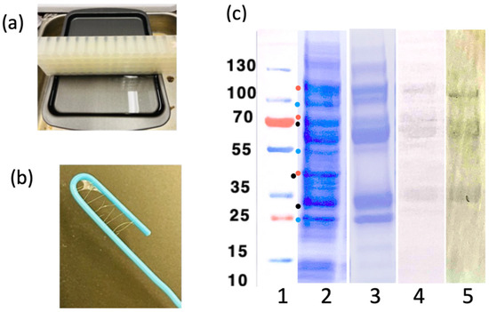 Biosensor fibers. (a) Buffer reservoir setup, used for making the fibers. (b) LOO11-SGMU fibers, approx. 100 μm thick, wrapped around a paper clip. (c) SDS-PAGE analysis of the LOO11-SGMU lysate before/after HisTrap (Ni-NTA) column chromatography. (Lane 1) Precision plus protein standards marked in kilodaltons. (Lane 2) Lysate. (Lane 3) HisTrap elution. (Lane 4) Western blot of elution using anti-Ubx. (Lane 5) Western blot of elution using anti-Histag. All gel images are aligned using standards. Dots in lane 1 are possible degradation product sizes based on locations of linkers. Blue dots contain the N-terminal Histag. Red dots contain the C-terminal Ubx. Black dots have neither.