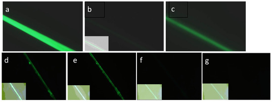 Results of SGMU Experiments 1, 2. (a) LOO11-SGMU fiber in fluorescence microscope using Nikon Blue filter. (b) Same fiber after glycine pH 2 buffer added. Inset in each case is an enhanced image optimized for contrast, showing presence and location of fiber. (c) Same fiber after phosphate pH 8 buffer added, observed for 5 min. Here, 35% of the original fluorescence returned. (d) Different LOO11-SGMU fiber under microscope using Nikon Blue filter. (e) Same fiber after CaCI2 buffer added, observed for 10 min with 40% loss in brightness. (f) Same fiber after glycine pH 2 buffer added, observed for 5 min. Less than 1% of brightness remains. (g) Same fiber after PBS pH 8 buffer added, observed for 5 min. No fluorescence is recovered. Signal-to-noise ratio is panel (c) divided by panel (g).