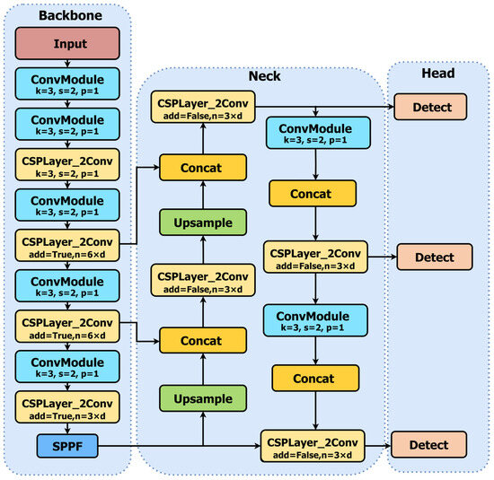 YOLOv8’s architecture consists of three parts: backbone, Neck, and Head, as illustrated in Figure 1. The backbone part comprises Conv, C2f, and SPPF modules, designed to extend network depth and the receptive field, enabling the fusion of local and global features. The Neck part includes C2f, Concat, and Upsample modules, integrating feature maps at different scales through a path aggregation network and C2f module, promoting vertical information fusion. The Head part adopts a decoupled structure, divided into classification and localization prediction branches, helping to resolve conflicts between the two. Compared to previous versions, YOLOv8 introduces an anchor-free design, using the sigmoid function to output the probability of detected objects and determining target objects through a threshold. YOLOv8 incorporates the Task Aligned Assigner for one-stage object detection and uses Distribution Focal Loss for regression loss to improve detection accuracy. These improvements enable YOLOv8 to demonstrate exceptional object detection, tracking, and segmentation performance.