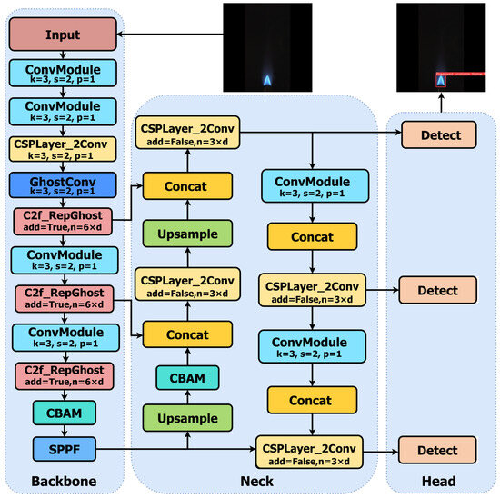 In this paper, we propose an improved YOLOv8n flame state detection method specifically optimized for low-pressure gas flames in plateau environments. By replacing the Conv and C2f modules in the backbone part of the original model with the GhostConv and C2f_RepGhost modules, respectively, we achieve a significant lightweighting of the model. In addition, the introduction of the CBAM attention mechanism further improves the model’s ability to capture fine-grained features of the flame, making it more efficient in recognizing flame features. The improved loss function enables the model to pay more attention to key flame features by introducing WIoU, which significantly improves the ability to distinguish the flame from the background, thus enhancing the robustness and accuracy of the model.