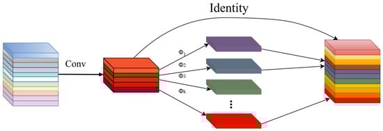 Therefore, Ghost Convolution (GhostConv), a convolutional module in the GhostNet network, effectively enhances the model’s efficiency and performance compared to standard convolution. GhostNet initially employs a 5 × 5 convolutional kernel to extract flame feature information from the input flame feature map, as illustrated in Figure 3. These feature maps undergo inexpensive linear transformations with a stride of 1 to derive new feature maps. The final feature map is obtained by concatenating these maps, reducing computational costs while preserving relevant feature information across different flame types.