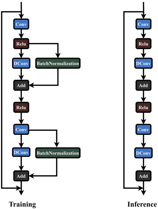 The reparameterization process of the RepGhost module is depicted in Figure 4. It involves generating an equivalent convolutional layer in the batch normalization (BN) branch and integrating this convolutional layer with the BN layer. During training, the RepGhost module applies deep convolution to input features, expanding feature dimensions. Subsequently, batch normalization (BN) enhances the nonlinearity of the training process, with this step potentially merged during inference. The feature maps produced by both branches are then added together, preserving the same number of channels. Finally, a ReLU activation function is applied to comply with the reparameterization rules, ensuring efficient inference.