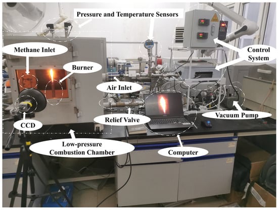 The experimental image data were obtained from the low-pressure gas combustion mechanism test bench at the University of Shanghai for Science and Technology. Taking Lhasa, a typical high-altitude city at 3650 m altitude with an atmospheric pressure of approximately 65 kPa, as an example, the experimental setup simulated its low-pressure environment using a vacuum pump and frequency converter to maintain the pressure in the combustion chamber around 65 kPa. Figure 6 illustrates the experimental setup. Oxygen, nitrogen, and methane were introduced into the combustion chamber at different equivalent ratios. An electronic ignition device ignited the mixture, and industrial CCD cameras captured images of gas flames under low-pressure conditions, including premixed stable flames, diffusion stable flames, premixed unstable flames, and diffusion unstable flames.