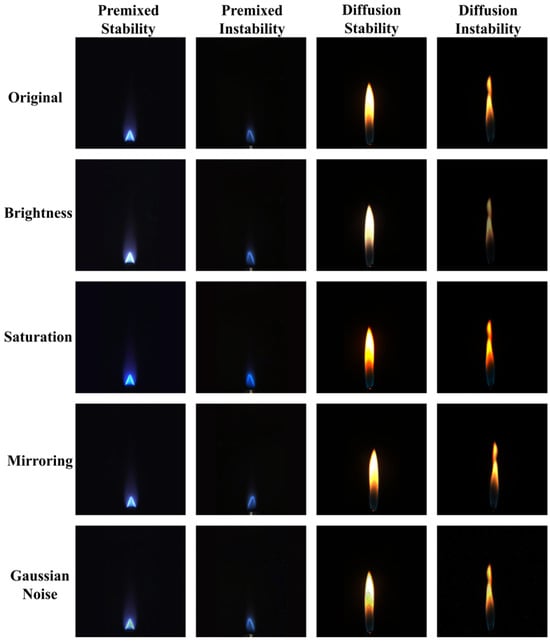 The collected video data were converted into PNG images using Python. To enhance the dataset’s diversity and improve the model’s generalization capability, data augmentation operations were performed on the images using the OpenCV library. These operations included random adjustments of image brightness, saturation, mirroring, and the addition of random Gaussian noise. The results of these operations are depicted in Figure 7. In total, 8140 images were obtained, comprising 3005 images of premixed stable flames, 1015 images of premixed unstable flames, 3100 images of diffusion stable flames, and 1020 images of diffusion unstable flames. All images were annotated using LabelImg and divided into a training set and a test set in an 8:2 ratio, resulting in 6512 images for the training set and 1628 images for the test set. The components are shown in Table 1: