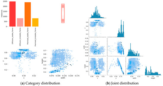 In order to analyze the distribution of targets in the flame detection task, we initially conducted a visualization of the dataset, focusing on the categorization of targets, their spatial distribution, and the dimensions of the targets. This analysis also revealed the geometric characteristics of the targets. As illustrated in Figure 8, the majority of targets are concentrated in the central region of the image, with a significant density around the origin of the x-axis. The y-coordinate is concentrated around 0.5, indicating that the flames typically occupy the central region of the image. Furthermore, the width and height of the flame targets fall within the ranges of 0.075 to 0.125 and 0.2 to 0.4, respectively. This indicates that the flames display a considerable vertical extension.