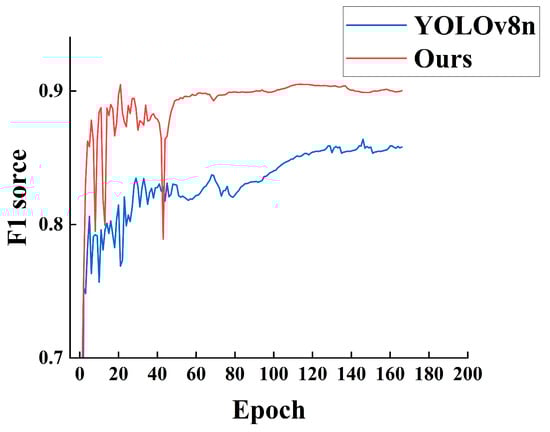 In the training of the enhanced model proposed in this study and the YOLOv8n model, hyperparameter settings for both models were kept consistent. The F1 scores for each model were compared throughout the iterations. Figure 9 presents the line chart depicting the F1 scores of both models over 200 training epochs. Initially, during the first 30 epochs, the F1 scores of the enhanced model were comparable to those of YOLOv8n, attributable to the absence of pre-trained weights. Between epochs 30 and 50, significant fluctuations were observed in the F1 scores of both models, with the enhanced model exhibiting higher F1 scores compared to YOLOv8n. After epoch 50, the models stabilized, with the enhanced model consistently outperforming YOLOv8n in terms of F1 scores.