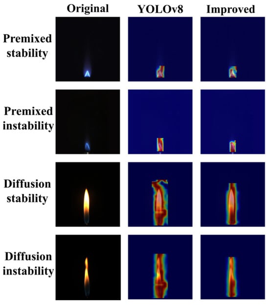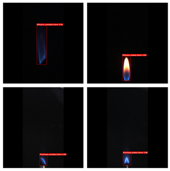 To further assess the performance of the enhanced model, the Grad-CAM (Gradient-weighted Class Activation Mapping) technique was employed to compare and analyze the attention mechanisms of YOLOv8n and the proposed model. The results, depicted in Figure 10, demonstrate that incorporating the CBAM (Convolutional Block Attention Module) significantly enhances the model’s performance in detecting flames under low-pressure conditions. Predictions on the test set flame data reveal that the model excels in accurately identifying and classifying flames, exhibiting high confidence and precise localization capabilities. Representative prediction results are illustrated in Figure 11.