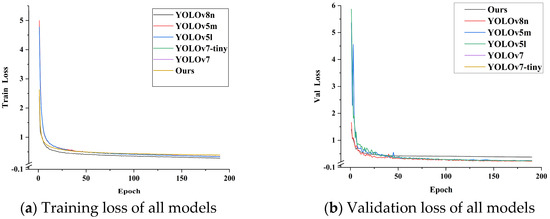Figure 12a shows the training loss for all models, which decreases rapidly in the early stages and stabilizes after about 50 rounds. The training loss curves of the improved models are very close to those of the other models, which indicates that all models perform relatively consistently on the training set, with no obvious signs of overfitting. Figure 12b shows the validation loss, which also shows a similar trend: most of the models drop rapidly in the first few rounds and then gradually stabilize, and the validation loss curves are close to those of the other models, suggesting that the models have good generalization ability.